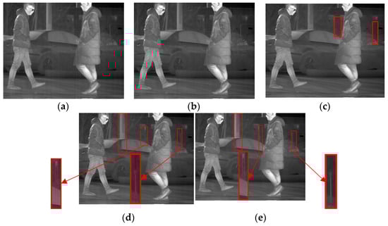 To validate the effectiveness of the proposed method, a series of experiments were conducted on images that contained stripe noise. Figure 16 shows the results of the first experiment. As demonstrated in Figure 16a, the denoising effect of MSGF was relatively poor as it could not effectively identify and remove irregular stripe noise with small horizontal gradient changes. Similarly, as shown in Figure 16b, the WAGE method retained a small amount of stripe noise, resulting in incomplete denoising. Furthermore, Figure 16c illustrates that FLCN caused over-smoothing of the original image in the horizontal direction, leading to relatively blurry edges of the person and vertical features of objects (enclosed by the red line).