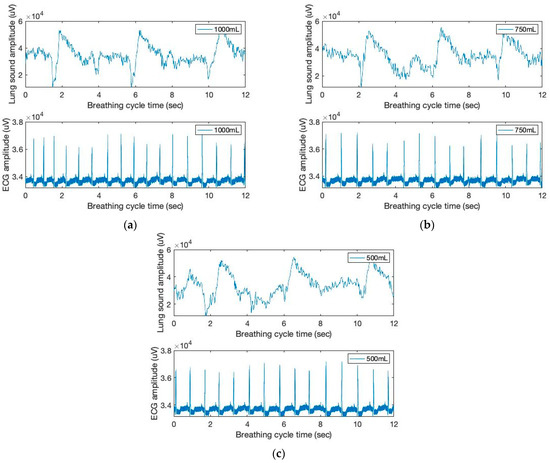The time and amplitude characteristics of lung sound and ECG signals of three breathing cycles obtained from the chest location; (a) 1000 mL, (b) 750 mL, and (c) 500 mL tidal volumes; one breathing cycle: 2 s inhale and 2 s exhale.