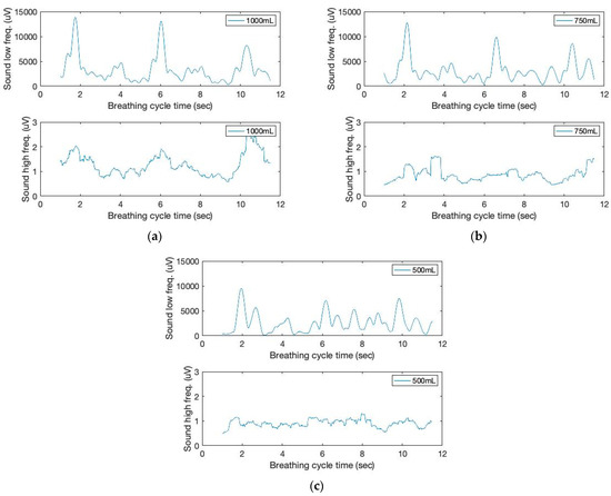 The time and filtered amplitude characteristics of ECG sound signals of three breathing cycles obtained from the chest location; (a) 1000 mL, (b) 750 mL, and (c) 500 mL tidal volumes; one breathing cycle: 2 s inhale and 2 s exhale.