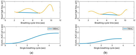 Moving variances are also calculated with a 250 ms data window and 1000 samples. The moving window variance computes the variability of each window’s sensor signal. Figure 4 depicts the high-frequency filtered signals and a seventh-order polynomial curve fit derived from the proposed sound sensor to separate low-frequency lung sound signals from the filtered signals. Identifying the repetition of the characteristic patterns and the peak heights from the cyclic pattern of the polynomial graphs enables monitoring respiration cycles and tidal volumes from the area under curve (AUC). The AUC calculated from the high-frequency filtered signals and a seventh-order polynomial curve fit are depicted in Figure 5. The AUCs derived from the sound sensor make approximately estimating tidal volumes possible without a spirometer. We calculated the derivative of the cumulative AUCs. The cumulative derivative AUCs relate to lung volume during inhaling. It demonstrates the different tidal volume patterns, which may be used for evaluating breathing conditions.