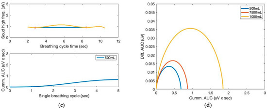 The AUC and cumulative AUC from lung sound signals obtained from a seventh-order polynomial curve fit of three breathing cycles obtained from the chest location; (a) 1000 mL, (b) 750 mL, and (c) 500 mL tidal volumes; one breathing cycle: 2 s inhale and 2 s exhale. (d) The cumulative derivative AUCs relate to lung volume during inhaling.