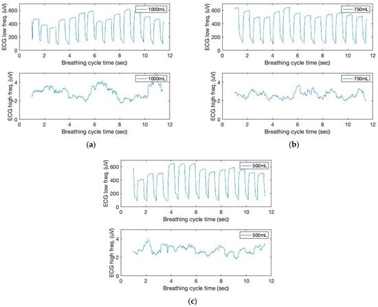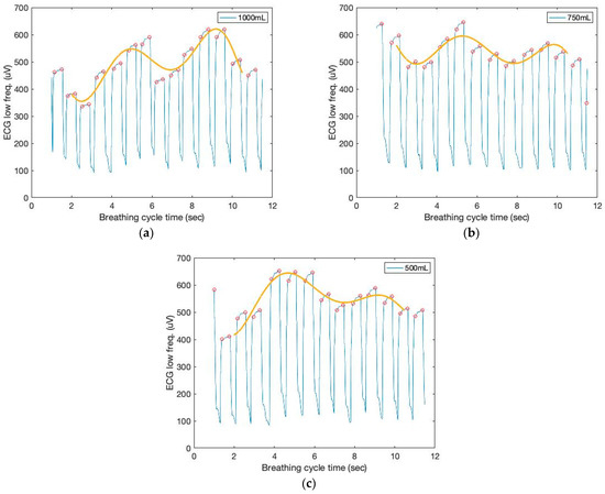 The time and filtered amplitude characteristics of the low-frequency filtered ECG signals and a seventh-order polynomial curve fit of three breathing cycles obtained from the chest location; (a) 1000 mL, (b) 750 mL, and (c) 500 mL tidal volumes; one breathing cycle: 2 s inhale and 2 s exhale.