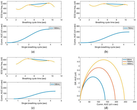 The AUC and cumulative AUC from ECG signals obtained from a seventh-order polynomial curve fit of three breathing cycles obtained from the chest location; (a) 1000 mL, (b) 750 mL, and (c) 500 mL tidal volumes; one breathing cycle: 2 s inhale and 2 s exhale. (d) The cumulative derivative AUCs relate to lung volume during inhaling.