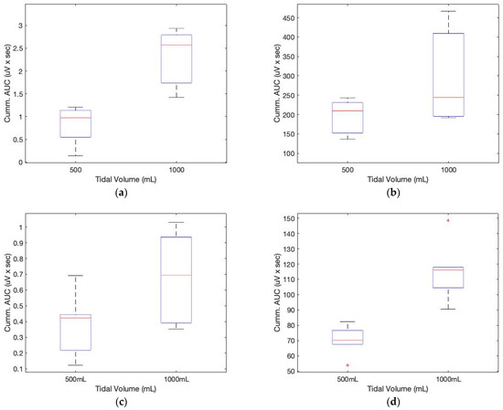 Box plots for the cumulative AUCs during one breathing cycle for different tidal volumes: (a) sound sensor data (subject 1); (b) ECG sensor data (subject 1); (c) sound sensor data (subject 2); (d) ECG sensor data (subject 2).
