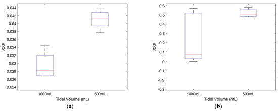 The sum of squared errors between the pre-stored template signature matrices and the measured matrices for different tidal volumes. (a) subject 1 (p-value: 0.0018); (b) subject 2 (p-value: 0.052).
