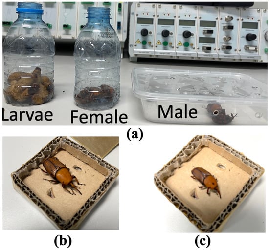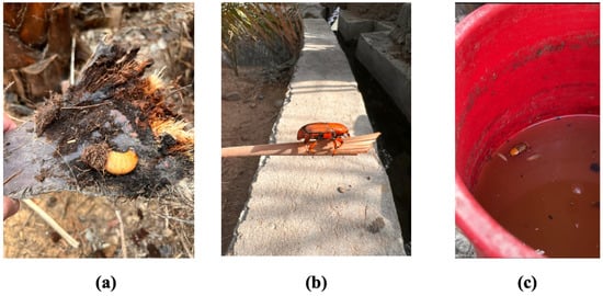 One commonly adopted management control technique for RPW pests is the use of traps. The traps are prepared by filling a container with an insect’s pheromone mixed with palm odor and water [1,2]. The traps can easily attract RPWs due to the strong effect of both substances (pheromone mixture with palm odor) in attracting other RPWs. Figure 1a,b depict photos of two collected palm weevil larva and an adult RPW, while Figure 1c shows a captured RPW inset inside a prepared trap in a red container in a local farm.
