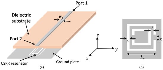 In the past twenty years, the integration of small-resonant metamaterial particles, in the form of split-ring resonators (SRRs) [11] or complementary split-ring resonators (CSRRs) [12,13], in planar microwave transmission lines has led to numerous developments of and enhancements to sensory elements and devices in many applications, including but not limited to radio frequency microwave circuits, and materials’ characterization and classification [14,15,16,17]. Complementary SRR can be regarded as a quasi-static resonator when its dimension is electrically small as compared with the operating wavelength of the excitation electromagnetic field. In such a case, the microwave CSRR resonance frequency is attributed to the equivalent -resonant tank circuit upon an excitation of an external normal electric field component to the resonator’s surface area, i.e., z-direction in Figure 2, where the current flow circulating around the CSRR metallic rings contributes to the inductance L, while the cuts (slots) in the two rings result in a developed distributed capacitance effect C. The resonance frequency of the CSRR can then be estimated using