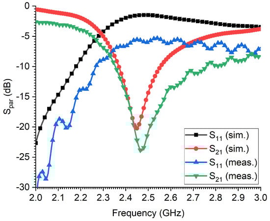 In this work, we deploy a microwave CSRR transmission-line-based sensor as a promising near-field probe for identifying the gender of an RPW, taking into account the advantages of such sensors in terms of their high sensitivity and narrowband operational band. Figure 2a shows the microstrip transmission line CSRR sensor, where a single CSRR unit cell (comprising of double concentric square rings with cuts in opposite sides) is etched out from the metallic solid ground layer, with a transmission line width of = 3.05 mm corresponding to a 50 Ω port impedance. Figure 2b shows a schematic for a complementary split-ring resonator unit cell. The optimized dimensions of the CSRR sensor are: = 9 mm, s = 1.575 mm, c = 0.45 mm and g = 0.5 mm, where its resonance frequency is 2.45 GHz, within the ISM frequency band. For convenience, an FR-4 square laminate of dimension 6 × 6 mm2 (with a dielectric constant of 4.4 and a loss tangent of 0.02) and thickness of 1.6 mm was chosen as the host medium of the microwave CSRR sensor. Figure 3 shows the scattering parameters’ response to both the reflection and transmission coefficients of the modeled microwave CSRR-TL sensor. The sensor resonates quite well at the 2.45 GHz-ISM band, as can be seen from the response, with a dip of −20 dB. Good agreement of the sensor’s performance can be seen between the simulated and measured results, despite a slight shift in the measured resonance frequency of less than 15 MHz. The slight discrepancy between the simulated and measured results is attributed to the cable losses.