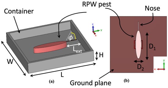 Figure 4 depicts the numerical setup showing a 2 mm thick rectangular container, (mimicking a small cardboard, with a dielectric constant of 2.7). For convenience, the dimensions of the container used are: L × W × H = 60 × 60 × 10 mm3. An adult RPW is modeled here as an elliptical cylinder ( × × 1.5 mm) and is placed at the center of the container from its base. In order to have a more realistic scenario for the modeled adult RPW, a thin nose was attached to the body of the pest with a length of = 10 mm.