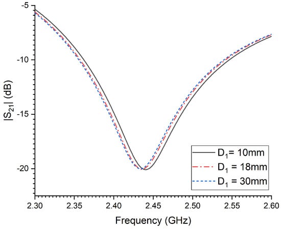 Next, we present a numerical parametric study to investigate the strength of the developed CSRR sensor in predicting changes in the RPW’s size, where is kept constant at 6 mm, while is arbitrarily varied. The incurred percentage shift in the sensor’s resonance frequency can be estimated using
