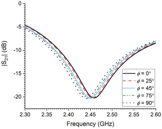 It is very important to consider all dielectric losses associated with the modeled RPW at their development stages, namely: larva, pupal chamber and adult. The dielectric constant and loss factor of three RPW genders were estimated from earlier measured data in [21] at 2.45 GHz, which are summarized and presented in Table 1. Figure 6 presents the numerical results of detecting movements of a small RPW larva, where a horizontal rotational movement, i.e., in terms of angle in Figure 4a, is varied within the -plane. It can be seen from Figure 6 that the CSRR resonance frequency tends to shift to lower frequencies as the rotational angle is increased from 0° to 90°, where the angle of 90° corresponds to an orientation that is perpendicular to the transmission line segment of the sensor. Moreover, the tendency of the sensor’s detection is quite noticeable and appreciable. Hence, the findings from this numerical study are valuable in tracking small movement activities of the RPW, especially during feeding stages.