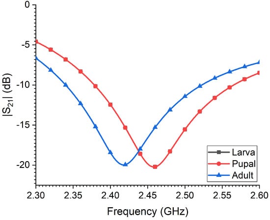 The simulated transmission coefficient of the sensor for modeled RPW at three different development stages: larva, pupal chamber and adult.