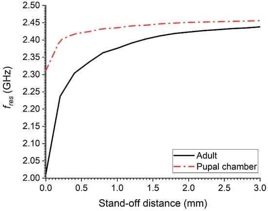 Figure 8 presents the simulation results from a numerical parametric study showing the effect of the stand-off distance, i.e., vertical distance between the top (body) surface of the RPW insect and the CSRR ground layer (bottom layer of sensor). In this parametric study, an adult and a pupal chamber were considered. As can be seen, the shift in CSRR resonance frequency is quite significant for the adult case as compared to the pupal case when the sensor is touching both the adult and the pupal insects, . The sudden resonance shift in the case of the adult RPW is due to the minimal inherent dielectric losses of the adult RPW as compared with a young insect. Furthermore, both cases reach minimal shift in resonance as the vertical stand-off distance is increased, which was kept at 3 mm for convenience. As such, a stand-off distance between 0.5 mm and 1.5 mm could be used in order to observe higher sensitivity, especially for the case of young RPW insects since they tend to absorb a significant amount of microwave energy and hence reduce their sensitivity strength.