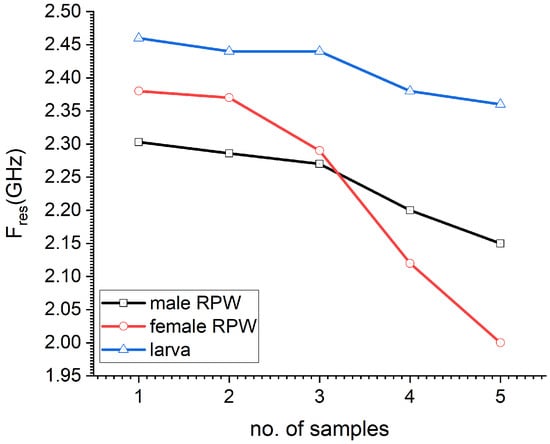 The assessment of detecting adult female RPWs’ gender using the CSRR sensor can be seen in Figure 14. In this case, the sensor has not recorded many changes in its resonance frequency for the first three samples when compared with the last two samples, i.e., samples 4 and 5. This is because the first three samples were quite comparable in body shape and size.