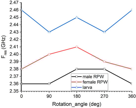 Figure 12 presents the measured resonance frequency of the CSRR sensor when exposed to a single RPW sample under four potential rotational mechanisms (see Figure 4): 0°, 90°, 180°, 270° and 360°, which reflects the movement of the RPW insects. From the presented measured data, we can see minimal changes in the detected resonance of the CSRR sensor, which was less than 70 MHz. This is justified due to the variation in electromagnetic field distribution when exposed to the RPW sample under the rotational movement cases.