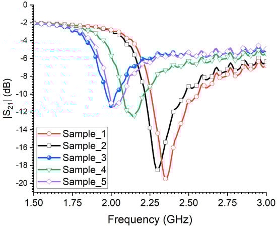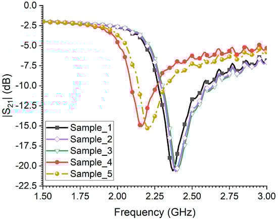 Figure 13 depicts the measured transmission coefficient of the microwave CSRR sensor as a function of frequency for five samples of adult male RPWs. We can see that the sensor’s resonances for samples 4 and 5 have not changed since the two last samples of male RPWs are comparable in size. Moreover, a similar trend in the sensor’s detection strength was observed for the five female RPW samples under testing, in which an increased frequency shift to the resonant frequency towards a lower frequency regime was seen as the female RPW’s size increased.