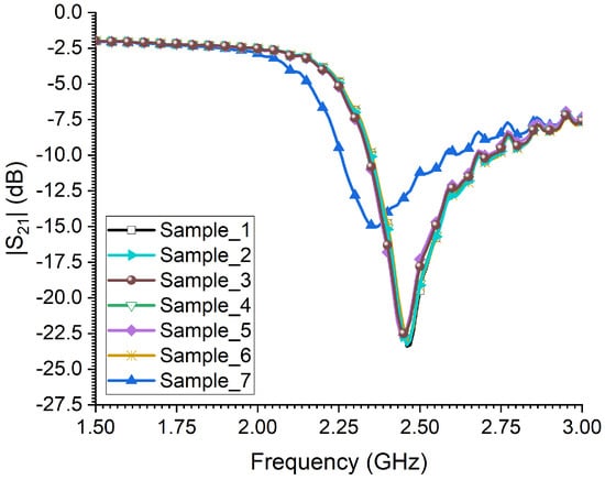 Lastly, the measured transmission coefficient of the CSRR sensor when exposed to seven samples of larvae is presented in Figure 15. Interestingly, not much change in the sensor’s resonance was observed for the larvae samples. This is justified since all samples are of similar body size and qualitatively an indication of similar body losses. Moreover, there is a slightly higher frequency shift of the sensor towards a lower frequency regime for sample 7, which corresponds to a large larva size.
