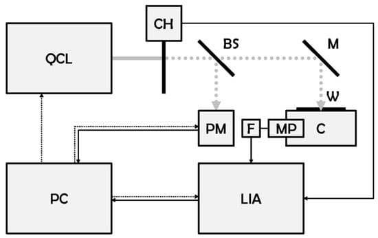 Block diagram of the LPAS system (old and new). BS: beam splitter, C: photoacoustic cell, CH: chopper, F: active low pass filter, LIA: lock-in amplifier, M: mirror, MP: microphone, PC: personal computer, PM: power meter, QCL: quantum cascade laser, W: window. Grey continuous line: continuous wave laser beam, grey dotted line: modulated laser beam, black continuous line: signal, black dotted line: control.