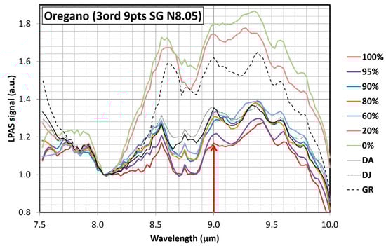Spectra of oregano “0%” (OR), olive leaves “100%” (OL) and mixtures with OL/(OR + OL) mass ratios of 20%, 60%, 80%, 90% and 95%. Third-order Savitzky–Golay smoothing on 9 points and normalisation to 8.05 μm have been applied. The only spectral region where evidently the value of the LPAS signal decreases monotonically with olive leaves concentration is around 9.0 µm. At 9.6 µm, for example, starting from the highest to the lowest LPAS signal, the following concentrations of olive leaves are found: 0%, 20%, 60%, 90%, 80%, 95% and 100%, i.e., the absorption for the sample with 90% olive leaves is higher than expected.