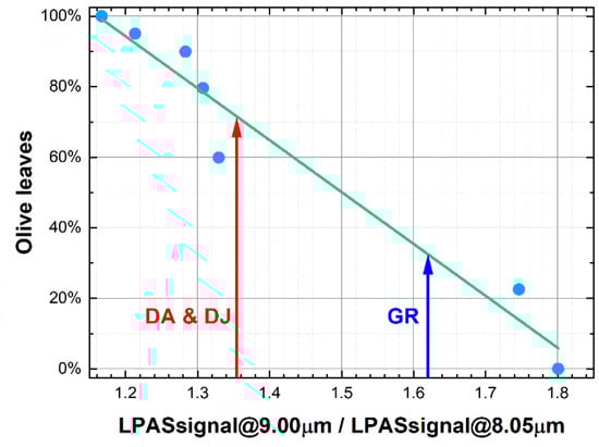 The spectra–after third-order Savitzky–Golay smoothing on 9 points and normalisation to 8.05 μm–are shown in Figure 3. Unfortunately, spectra are quite entangled. Moreover, the morphological differences between the curves of oregano and olive leaves are rather small: the peaks have more or less the same positions, but the intensity of absorption changes between about 8 and 10 μm. Nevertheless, at 9 μm, the value of the LPAS signal decreases monotonically with olive leaves concentration and a linear relationship was found between these two variables (Figure 4). Related to linear fitting, R-squared (also known as the coefficient of determination) is a statistical measure of how well the straight line matches the observed data [18]. Its maximum value is 1, and the higher it is, the better the fit. Residuals and distances of the dependent variable are first calculated to obtain it. A residual is the difference between the observed value and the predicted value, while a distance is the difference between the observed value and the mean of the observed values. Then, the residual sum of squares (RSS) and the total sum of squares (TSS) are computed: RSS is the sum of the residuals squared, and TSS is the sum of the distances squared. Finally, R-squared is 1–RSS/TSS.