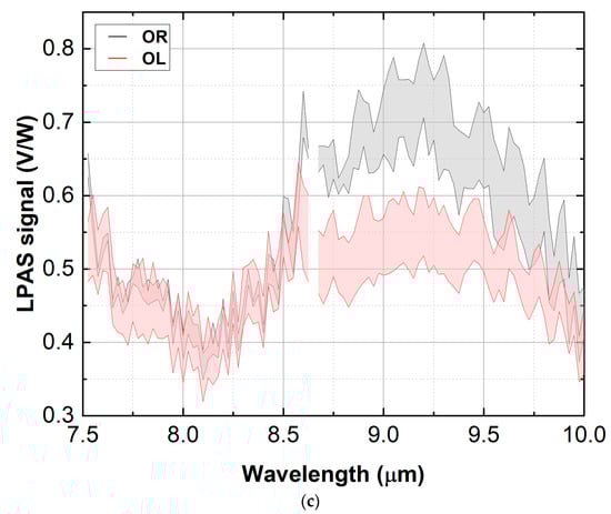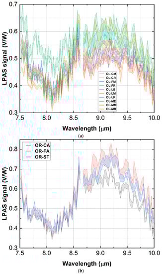 The spectra are shown in Figure 5 as bands centred on the mean of the measurements and with a thickness equal to the standard deviation. Although some olive cultivars display a more intense LPAS signal, Figure 5a shows that the pattern of the curves is the same for all of them. Since the samples of the various olive cultivars were mixed in the subsequent investigation, the purpose of Figure 5a was simply to show that the spectra of the various cultivars are similar and, therefore, it is justified to mix them, which is why it was not considered a problem if they do not stand out totally in the graph. Slightly different is the case with oregano shown in Figure 5b: the OR-CA sample shows a somewhat less intense LPAS signal between 9 and 10 μm. However, the oregano spectra were considered to be sufficiently consistent: in the region around 9 μm, the average of the oregano varieties differs significantly from the average of the olive cultivars, as can be seen in Figure 5c. The same graph also shows that the spectra of olive and oregano are morphologically similar, i.e., they have the same general pattern despite a difference in intensity of around 9 µm. The situation is different when spice and adulterant have totally different peaks, as was the case with saffron mixed with turmeric and tartrazine (an artificial compound) [10].
