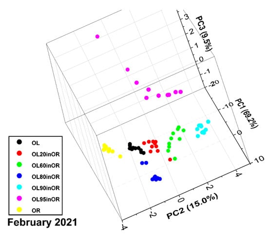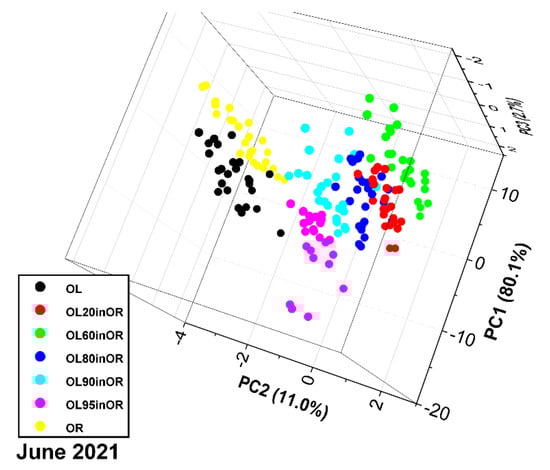 The PCA score plot is shown in Figure 8. The first three principal components explain 93.8% of the variance. For run 06-2021, similar considerations apply as for run 02-2021, especially regarding nonlinearity. Furthermore, on the one hand, the point clouds have more overlap; on the other hand, the samples with 60%, 80%, 90% and 95% adulterants are arranged approximately along a straight line. The discrepancy between pure components and mixtures, already observed in the previous run, may be due to physicochemical phenomena related to mixing that alter the photoacoustic response of the sample.