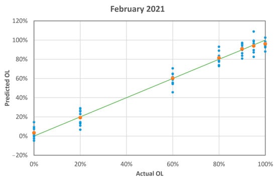 The blue dots are the PLS-predicted mass ratio of olive leaves vs. the actual mass ratio (measurement run 02-2021). The orange dots are the averages of the blue dots. The green line is the linear fit of the orange dots having intercept: 0.02 ± 0.02; slope: 0.97 ± 0.02; R-squared: 0.998.