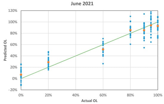 The blue dots are the PLS-predicted mass ratio of olive leaves vs. the actual mass ratio (measurement run 06-2021). The orange dots are the averages of the blue dots. The green line is the linear fit of the orange dots having intercept: 0.08 ± 0.04; slope: 0.88 ± 0.06; R-squared: 0.977.