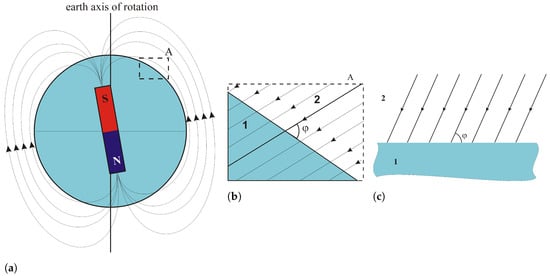 Earth magnetic field (a) global view, (b) local view of A detail (c) local view of A detail in classical perspective (earth surface horizontal); 1—earth; 2—air (or water); —magnetic field inclination.