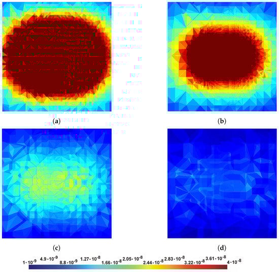 Exemplary relative () change of the magnetic field at the following heights: (a) 1 m; (b) 2 m; (c) 3 m; (d) 4 m over the ferromagnetic object—plot from simulation, external dimension of the plot area is 6 m × 6 m.