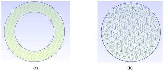 The use of a cylinder as a model made it possible to maintain the correctness of the discretization mesh in the object area and reduce the number of mesh nodes. Exemplary meshes for a pipe and a cylinder are shown in Figure 6a,b.