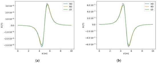 For three models differing in mesh density for each variant (tube, cylinder) (described above), a comparison of the obtained results was performed. The linear distribution of changes in magnetic induction () in the directions N-S and E-W was adopted as a measure. Here, we simulated a path of a magnetic sensor passing 1 m above the object. The graphical comparison of the recorded signal, representing the influence of the grid quality is presented in the Figure 7a (N-S) and Figure 7b (E-W).