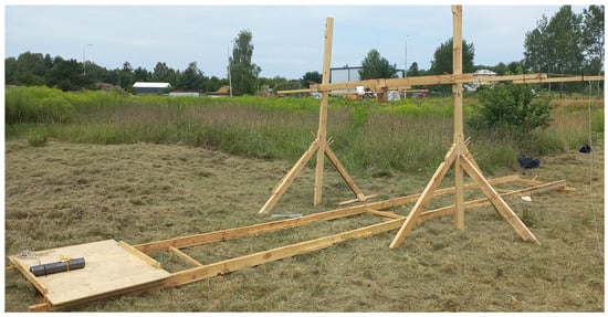 As already indicated, the empirical experiments were conducted using a pipe 343 mm long and 75 mm in diameter. Because the water environment does not affect the magnetic field, we conducted the experiments out of the water, in an environment free of magnetic sources other than the natural Earth magnetic field. To ensure a space free of ferromagnetic objects other than the UXO substitute, the construction of the measuring station was made of wood without any nails or screws, every part was assembled with wooden nails. At the test stand, the magnetometer or magnetometers were mounted on a wooden frame above the test object—similar to the mission with the use of AUV vehicles. The only difference was that, in the tested environment, it was the UXO object that moved. It was moved on the rails under the magnetometer, simulating a passage over the UXO object by the AUV containing the magnetometer. This allowed us to keep the computer station, which collects the measurements, separate from the measuring station. The magnetometers were hanged on 1.4 m above the rails, and the length of the rails was 7 m. The magnetometer was located in the middle of the rails. A view of the measuring station is depicted in Figure 8.