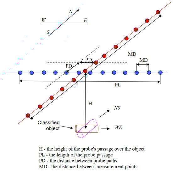 In the experiments, we used the Geometrics MFAM LCS1005S magnetometer. The configuration of the measuring environment was as follows: orientation sensors for heading error cancellation, run mode: Low Noise and Two Independent Sensors, sampling frequency 1 kHz, notch filter 50 Hz. The measurement scheme is shown in Figure 9.