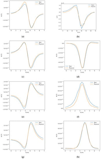 Visual representation of the match between the digital twin and the real magnetometer data. (a) N-S, N-S; (b) E-W, N-S; (c) NE-SW, N-S; (d) Perpendicularly N-S; (e) E-W E-W; (f) N-S E-W; (g) NE-SW, E-W; (h) Perpendicularly, E-W.
