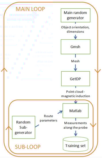 Figure 13 shows the scheme of generation of the training set. The process consists of two loops. In the main loop, a random generator provides orientations and sizes of the modeled objects (in the range determined by the input parameters of the process). On this basis and the material parameters given at the input of the process, the Gmsh/GetDP model calculates the distribution of magnetic induction represented by a cloud of points. At this point, the inner subloop begins. The subgenerator randomizes the parameters of the probe route and, on this basis, the interpolator implemented in MATLAB simulates the magnetic field measurements during the passage of a group of probes. The scope of route randomization is also described by a set of input parameters of the generation process. After each flow simulation, another case is added to the training set.
