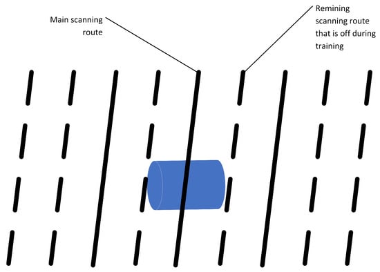 In all cases, the magnetization was selected randomly in the range 0–0.3T, and it was assumed that the direction of magnetization is always consistent with the longest dimension of the object. This allowed us to run in total around 1600 simulations of these objects (digital twins). Then, for each digital twin, 30 random scanning routes were generated using the Matlab subroutine, where it was assumed that the height of the sensor’s path above the object is determined randomly within a range of 1 m to 3 m. The height of the probe is determined once for a single scan. Additionally, as indicated in the previous section, we added an element of randomness to the location of the sensor by adding a noise with a maximum amplitude of 10 cm. The direction of the scanning route was selected at random in the range 0–180 deg. This limitation results from the fact that, in the range 180–360 deg., the recorded signals are identical, and only flipped. Additionally, in the conducted simulations, it was assumed that a single scanning route consisted of a formation of nine virtual magnetometers, parallel to each other, as shown in Figure 14, where the fifth magnetometer always passes directly over the center of the object. The distance between the paths is 0.5 m. These nine parallel paths allow us to train and validate the prediction model in several scenarios. For example, by switching on and off particular routes, we can simulate scenarios when a particular magnetometer is scanning on the side of the UXO object instead of the center, or to identify the effect of the distance between virtual magnetometers on the prediction quality. In total, it resulted in around 48,000 training samples each consisting of nine parallel sensors recording the data. Therefore, the recorded data constitute a 4d tensor of 48,000 samples, nine probes, and 101 values of x, y, and z coordinates of the magnetic field.