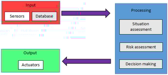 Figure 1 shows the basic architecture of an anti-collision system that will be implemented in a vehicle. Anti-collision systems consist of two major parts: the input and output [15]. These parts can also be recognized as perspective and action. Any system designed to prevent accidents from happening must begin with perception, or more specifically, obstacle detection [16]. At this stage, sensors gather information about the surrounding area and locate any hazards. However, the active part comes after the perspective, where once the threat has been detected, the situation will be analyzed by the computation of the control system of the UAVs. As a result, the actuators will implement proper countermeasures to avoid the hazard [17].