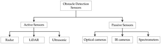 Sensing using active sensors involves emitting radiation and then detecting the reflected radiation. All the necessary components, including the source and the detector, are built within an active sensor. A sensor works by having a transmitter send out some signal (light, electricity, sound) that then gets reflected off of whatever it is being used to detect [34,35]. Most of these sensors operate in the spectrum’s microwave range, allowing them to penetrate the atmosphere under most circumstances. The metrics of interest of the obstacles, such as distance and angles, may be adequately returned by such sensors since they have a short reaction time, need less processing power, can scan more significant regions quickly, and are less impacted by weather and lighting conditions. In [36], the authors use MMW radar. In their setup, things are detected and followed by watching radar echoes and figuring out how far away they are from the vehicle. Different distances and weather conditions are also used to conclude the performance. Despite the allure, radar-based solutions are either too costly or too heavy to be practical on more miniature robots, such as battery-powered UAVs [37,38].