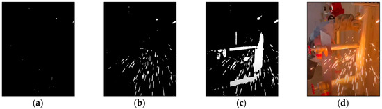 Furthermore, we filtered welding sparks detected using predetermined thresholds as shown in Algorithm 2. Contour detection is designed to detect welding sparks using an HSV threshold dictionary. In the majority of situations, welding sparks are the brightest part in the corresponding RGB welding image, but the welding process also generates intense light that white surfaces can reflect. This intense light is the most common noise in the proposed welding spark detection color mask. If the welding is processed outdoors, sunlight is another noise source. Thus, we set two thresholds of the area of detected contour to eliminate noise in the proposed welding spark detection method: a number of pixels in bounding boxes below 1 and over 400 pixels. These thresholds were identified by sensitivity testing of the dataset.