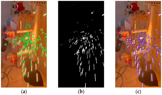 An example of welding spark detection using the contour detection method: (a) ground truth labeling sample; (b) hue saturation value color mask result; (c) welding spark detection result.