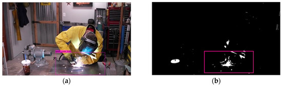 Boundary coordinates of detected welding zones can be created as shown in Figure 4. For example, the proposed method detects a set of sparks and outputs their coordinates, yet the detection result frequently contains noises and error detection. Furthermore, the current deep learning method is not designed to work with two individual deep learning models. Thus, we stored welding zone detector output coordinates in x, y, w, h format, then sent them into the proposed welding spark detector. Then, the open computer vision library (OpenCV) draws a rectangle for display. We also used a set of if statements to filter out proposed welding spark detection coordinates that do not belong to the detected welding spark zone. Through this process, the proposed method can filter out the detection error of the proposed welding spark detection method.