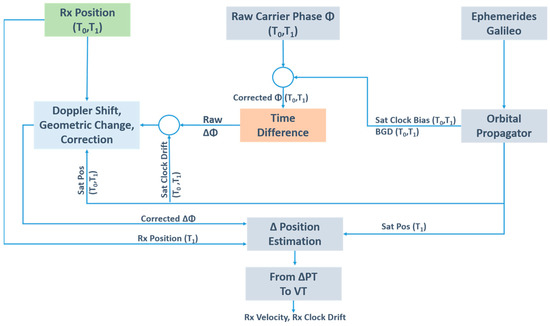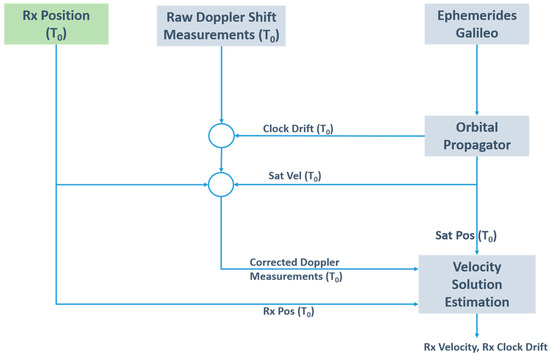 For the velocity estimation, the position of the receiver is considered known; similarly, the position and the velocity of the satellite are known as its coordinates are obtained from information in the navigation message (in particular, the details of the computation of are in [24]).