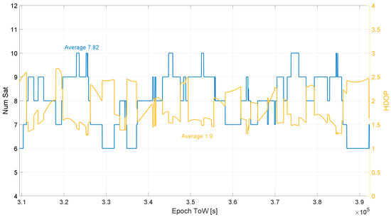 The antenna was located in open-sky conditions, the number of visible satellites and the horizontal dilution of precision (HDOP) time evolution are shown in Figure 3. From this figure, it can be noted that a high number of Galileo satellites (between 6 and 10) were available during the whole data collection period; an average of about 7.82 satellites were visible during the test. In order to consider the geometric conditions during the data collection, the HDOP values are shown in Figure 3 (yellow line with values reported on the right y axis). The HDOP values vary between 1.44 and 2.68 with an average value of about 1.9. The satellite availability and the geometric conditions are typical of open-sky users.