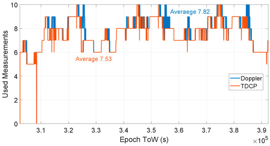 The first difference between the Doppler-based velocity estimation and the TDCP velocity estimation is the measurement availability. The TDCP technique requires the availability of two consecutive carrier phase measurements, while the Doppler method only relies on the availability of a single epoch observation. This aspect is analysed in Figure 4, where the number of used measurements for the different methods, considering E1 frequency, is shown. From the figure, it can be noted that the number of measurements for the TDCP case is always lower than that for the Doppler case, which is due to the intrinsic nature of the time difference approach which needs two consecutive measurements. The average number of used measurements for the Doppler case is 7.82, while for the TDCP method, the value is reduced at 7.53. This element, in open-sky conditions, does not significantly impact the performance in terms of solution accuracy; however, in obstructed scenarios where the satellite tracking is not continuous and the carrier phase availability is more limited, it could reduce the solution availability of the TDCP method. In this test, both methods were able to provide a continuous solution during the whole session. To avoid repetition of similar results, the analysis for the other frequencies is not shown.
