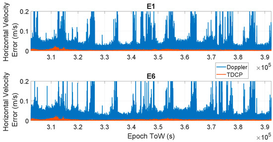 Horizontal Velocity errors as a function of time considering Doppler-based (blue line) and TDCP (red line) methods. Upper box: E1 frequency, lower box: E6 frequency.