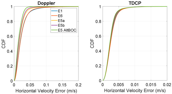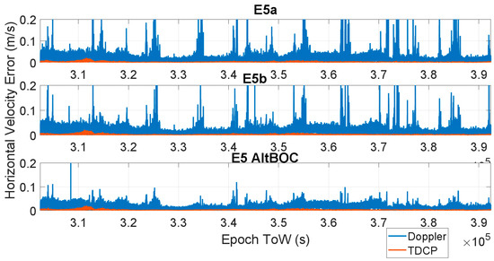 Doppler-based velocity demonstrated errors one order of magnitude larger, that is, of a few cm/s. In this case, the different signals provided significantly different performance. Specifically, significant benefits are evident with E5AltBOC measurements, which outperform E5a and E5b measurements, and still more E1 and E6 measurements. In terms of mean and standard deviation for the horizontal channel, the AltBOC solution was the only solution with values lower than 20 cm/s (16 cm/s and 14 cm/s, respectively).