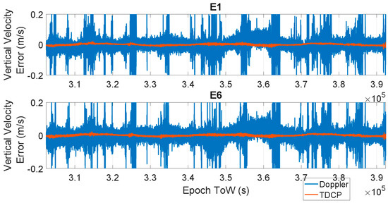 Time evolution of the vertical velocity error considering Doppler-based (blue line) and TDCP (red line) methods. Upper box: E1, lower box: E6.