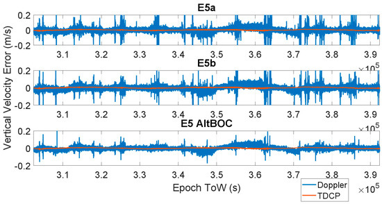 The time evolution of the vertical velocity error is shown in Figure 7 and Figure 8 for all the considered frequencies. In Figure 7, the E1 (upper box) and E6 (lower box) cases are considered; in Figure 8, the three cases related to E5 frequencies are shown: upper part E5a, central box E5b, and lower box E5AltBOC. The results are very similar to the horizontal channel, and also in this case, the Doppler-based velocity has a larger error. Also, in the vertical channel, the most accurate solution for the Doppler measurement cases is obtained using E5AltBOC observables; indeed, a maximum error of about 30 cm/s was observed, while a larger error about 0.7 m/s was obtained with the other frequencies. When the TDCP approach is used, the maximum vertical velocity error varies between 0.013 m/s (AltBOC case) and 0.031 m/s (E1 case). For all the considered frequencies, a visible reduction in the vertical velocity error can be noted.