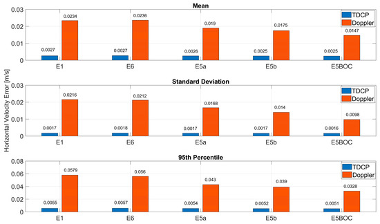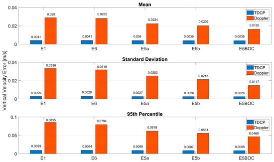 In Figure 9 and Figure 10, the statistical parameters used to summarize the performance of the two approaches are shown, for the horizontal and vertical errors, respectively. In the upper box the mean values are reported; in the central box the standard deviation values are shown; finally, in the lower box the 95th percentile is considered. From the upper plot of Figure 9, it can be noted that for the Doppler-based velocity, the mean error is reduced using E5AltBOC measurements and the largest values are obtained using E1 and E6 measurements. A similar trend can be observed when considering the standard deviation (central plot) and the 95th percentile. In particular, the advantages of using E5AltBOC Doppler observables clearly emerges in the standard deviation case: the solution obtained using AltBOC observables is the only one with a standard deviation lower than 10 cm/s. Comparing blue and red bars, the advantages of the TDCP method clearly emerge for all the considered parameters. For the TDCP case, no specific improvements can be noted using AltBOC measurements; indeed, only differences in the order of submillimetres per second are observed among the solutions: the mean errors are within the interval 2.4 mm/s (AltBOC case) and 2.7 mm/s (E6 case). In terms of standard deviations, all the solutions have a very similar value of about 1 mm/s. Finally, in the 95th percentile case, the values for the TDCP methods are about 5 mm/s, while for the Doppler case, the values are between 32 cm/s (AltBOC case) and 57 cm/s (E1 case), confirming the large variability in the Doppler-based velocity estimation.